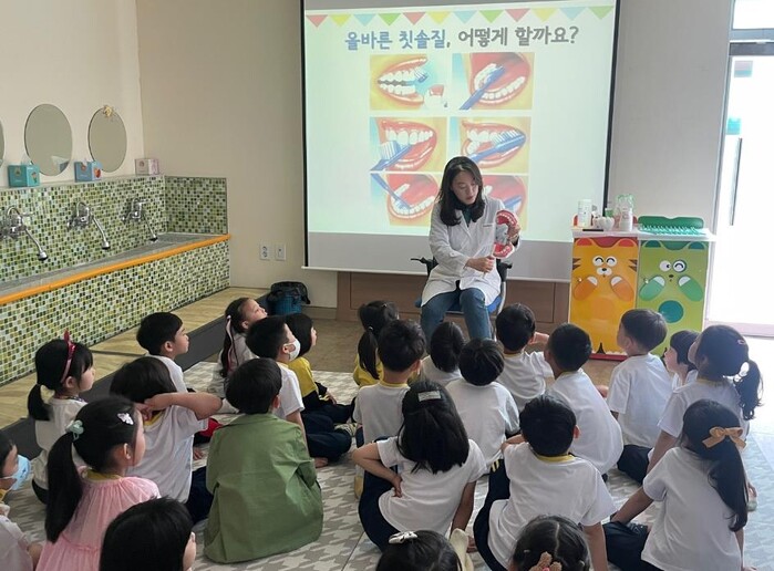 먼저, 아이들은 시청각 매체로 치아의 기능, 충치의 원인과 예방에 대한 이론 수업을 듣고 1대1로 양치를 실습하게 된다. 특히 실습에서는 치면착색제를 도포해 플라그를 관찰하고, 양치하기 힘든 부위를 눈으로 확인해가며 올바른 양치의 중요성을 몸소 깨닫게 된다.