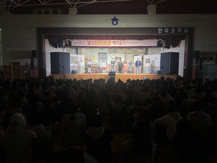 지난 10월 1일과 22일 ▲동일공업고등학교 ▲현화중학교에서 진행된 뮤지컬 <메리골드>는 옴니버스 형식으로 구성되어, 서로 다른 사연을 지닌 인물들의 이야기를 통해 청소년들이 가족과 친구, 그리고 자신의 삶을 되돌아보며 생명의 소중함과 공감의 가치를 느낄 수 있도록 기획되었다.