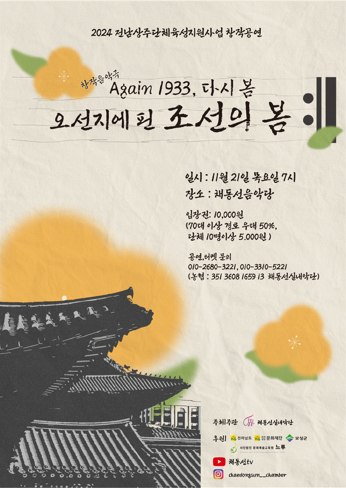 ‘Again 1933, 다시 봄’은 보성 경전선 개통과 채동선실내악단이 창단된 1933년도 일제강점기 시절 음악을 통해 시대의 아픔을 치유하고 희망을 전파했던 음악가들의 이야기를 담아낸 창작 음악극이다.