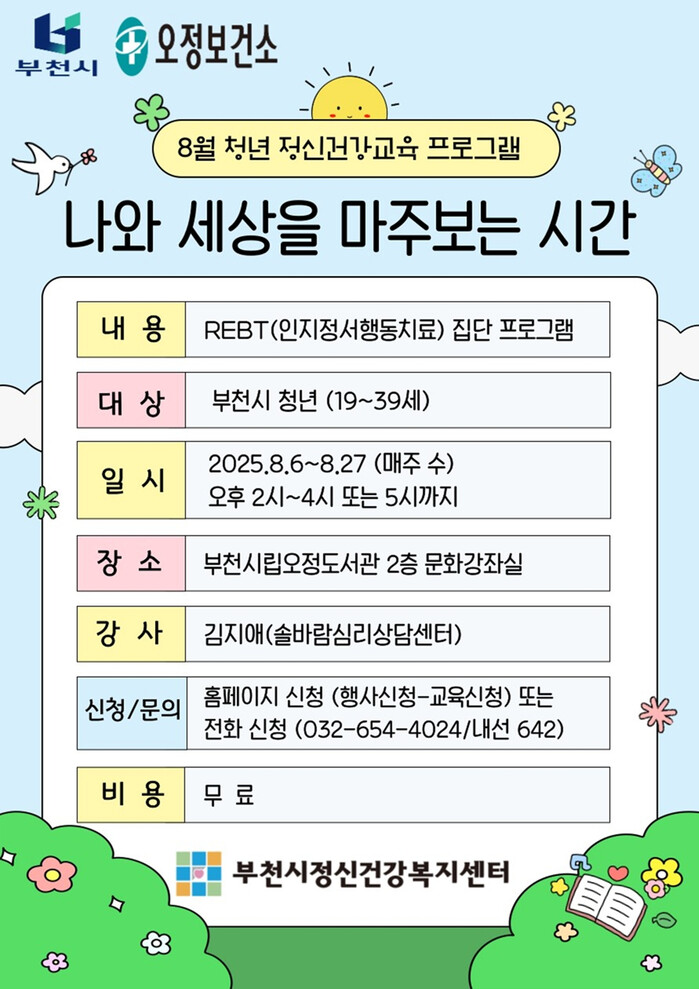 시에 거주하거나 활동 중인 19세부터 39세 이하 청년이면 누구나 참여할 수 있으며, 신청은 부천시정신건강복지센터 홈페이지 또는 전화를 통해 8월5일까지 선착순으로 접수한다.