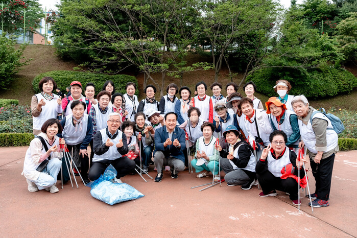 오산감돌대학 노인 교실 프로그램에 참여 중인 노인 50여명이 경기 오산시 고인돌공원 장미정원에서 환경정화활동인 ‘플로깅’을 진행했다. 사진은 이권재 시장이 플로깅에 참여한 노인들과 기념 촬영을 하는 모습. (사진=오산시청 제공)