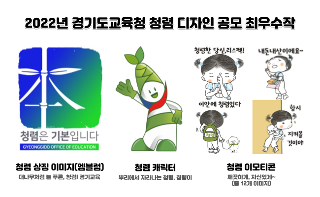 청렴 상징 그림(엠블럼)과 청렴 그림말(이모티콘) 분야 최우수 작품은 성인부 ‘대나무처럼 늘 푸른, 청렴! 경기교육’과 ‘깨끗하게, 자신있게~’가 각각 차지했다.