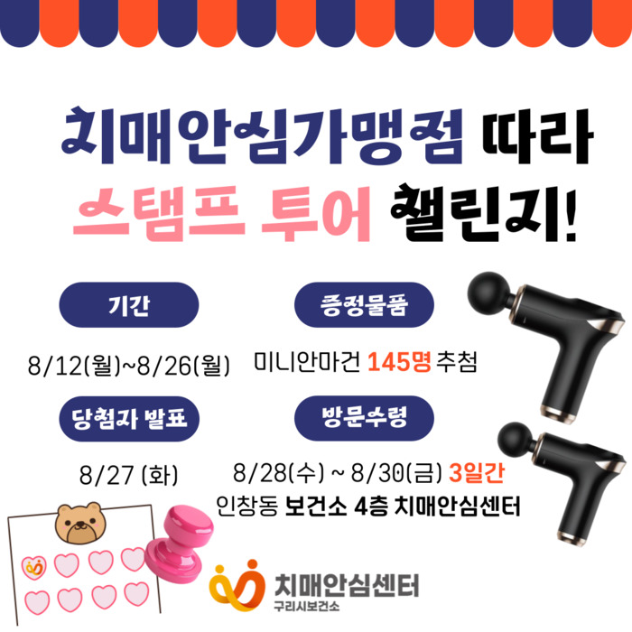 이달 12~26일 2주간 치매친화적 환경을 조성한 치매안심가맹점을 알리기 위해 지역주민을 대상으로 진행되는 이번 행사는 휴대전화 앱 ‘워크온’내 ‘구리시 공식, 치매안심센터, 구리 치매안심마을 커뮤니티’ 가입자를 대상으로, 기간내 치매안심가맹점 8곳 중 3곳 이상 방문한 사람에 대해 무작위 추첨을 통해 미니 안마건을 지급한다.