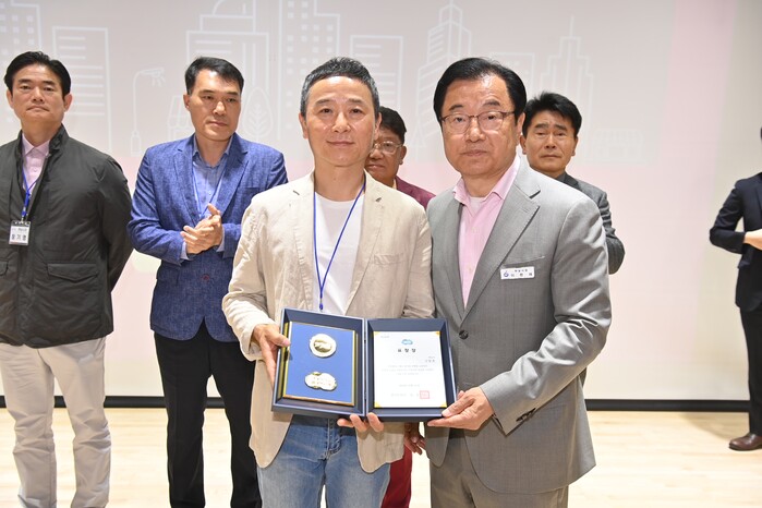 경기 하남시는 최근 신장사거리 인근에서 의식을 잃고 쓰러진 한 시민을 심폐소생술로 소생시킨 환경미화원 신창흔씨에게 표창을 수여했다. 사진은 이현재 시장(오른쪽)이 신씨에게 표창을 수여한 뒤 기념촬영을 하고 있는 모습. (사진=하남시청 제공)