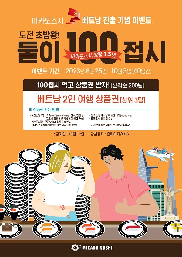 미카도스시가 마련한 본 이벤트는 전국 미카도스시 가맹점에서 가족, 친구, 연인 등 성인을 포함한 중학생 이상의 2인(1팀)이 제한시간 50분내에 100접시 도전에 성공하면 매장에서 즉시 20만원 상당의 미카도스시 상품권을 지급하는 방식으로 구성되었으며, 100접시 도전에 성공해 도전 과정이 담긴 영상을 본사에 전달한 고객 중 상위 3팀을 선발해 베트남 여행상품권(2인)을 제공한다. 더불어 베트남을 포함한 세계 각지의 불우 이웃을 위한 2억만동 기부까지 함께 진행된다고 전했다. 이벤트는 8월 25일부터 10월 3일까지 전국 미카도스시 매장에서 40일간 진행되며 결과는 10월 20일에 발표될 예정이다.