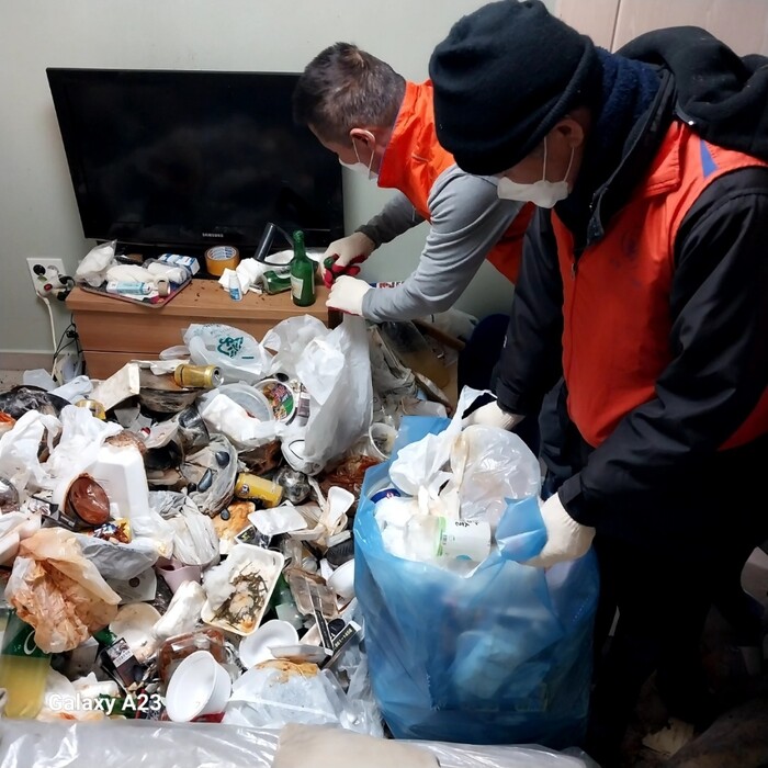 경기 동두천시 생연1동 행정복지센터는 최근 로컬드림봉사회 주관으로 생연1동에 거주하는 저소득 지체장애 가구에 대한 주거환경개선 봉사활동을 실시했다. 사진은 봉사자들이 대상가구에서 쓰레기를 치우고 있는 모습. (사진=동두천시청 제공)