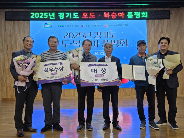 지난 9월 17일 경기도농업기술원이 주관한 2025년 경기도 포도·복숭아 품평회에서 안성시 서운면 신용섭 농업인이 출품한 샤인머스캣이 포도 부문 대상을 수상했다. 이어 서운면 김진혁 농업인은 거봉으로 최우수상을, 일죽면 조황주 농업인은 장호원황도로 복숭아 부문 장려상을 수상하며 안성 농가의 위상을 높였다.