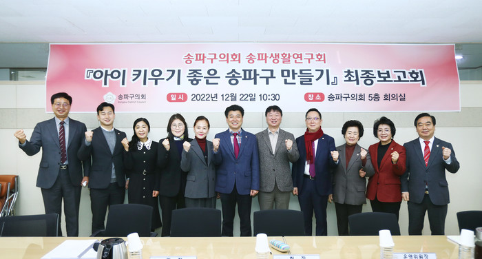 송파생활연구회 의원들은 송파구의 인구학적 특성, 돌봄환경 실태 분석과 서울특별시 및 타 지방자치단체의 육아지원정책 사례 분석을 통하여 아이 키우기 좋은 송파구를 만들기 위한 육아지원정책 방향을 도출하였으며, 이를 달성하기 위하여 △아이존중 신의(믿고 공정한ㆍ믿고 맡기는)돌봄, △튼튼돌봄, △아동친화 지역돌봄이라는 3가지 정책목표와 7개 추진전략 및 14개 세부 추진과제를 제시하였다.
