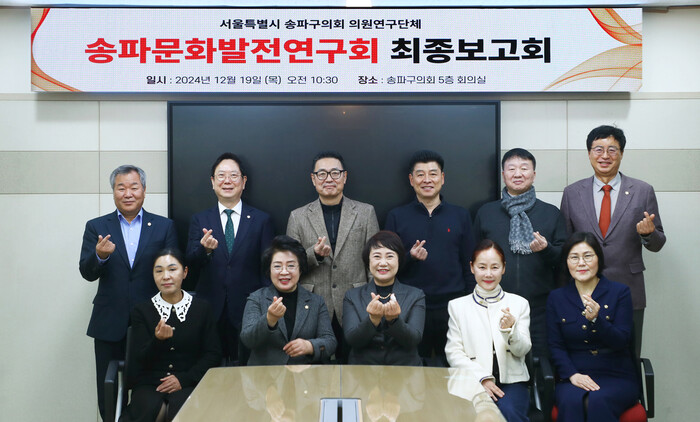 ‘송파문화발전연구회’는 올해 2월 발대식을 시작으로 송파구 문화재단 발전 방안에 대한 연구를 진행해왔다. 그간 현장 방문 및 1, 2차 중간 보고에서 타 지자체 문화재단 성공사례 분석, 문화재단 설립에 관한 이론 및 법률에 관해 검토했으며, 소속 의원들은 꾸준한 질의와 토의를 거듭하며 송파구 문화재단의 발전방안에 대한 연구를 이어왔다.