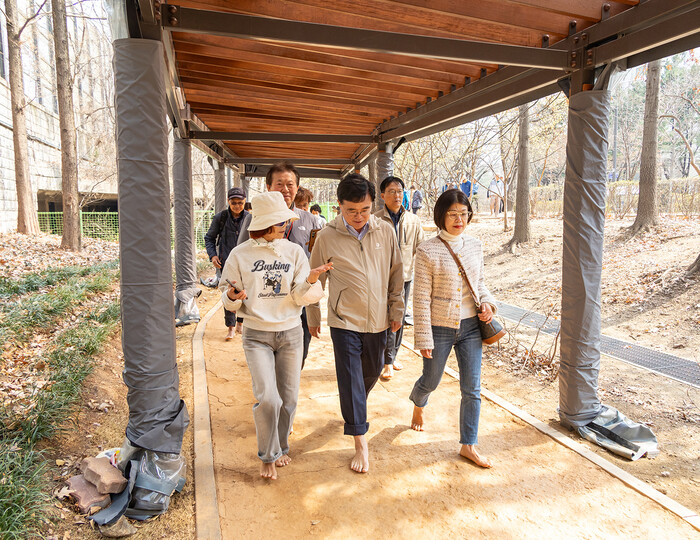 서울 강서구가 가양동 공암나루근린공원에 서울에서 가장 긴 1.7km 규모의 황톳길을 조성하고, 24일 현장 간담회를 진행했다. 사진은 진교훈 구청장(가운데)이 주민들과 황톳길을 걷는 모습. (사진=강서구청 제공)