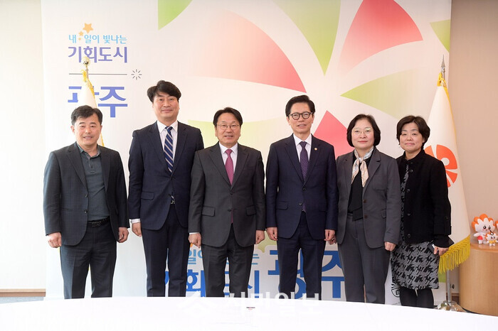 | ▲ 강기정 광주광역시장(왼 쪽부터 세 번째)이 21일 오전 시청 접견실에서 황정근 국회도서관장을 접견한 후 양 기관 관계자 등과 기념촬영을 하고 있다. /광주광역시 제공 |