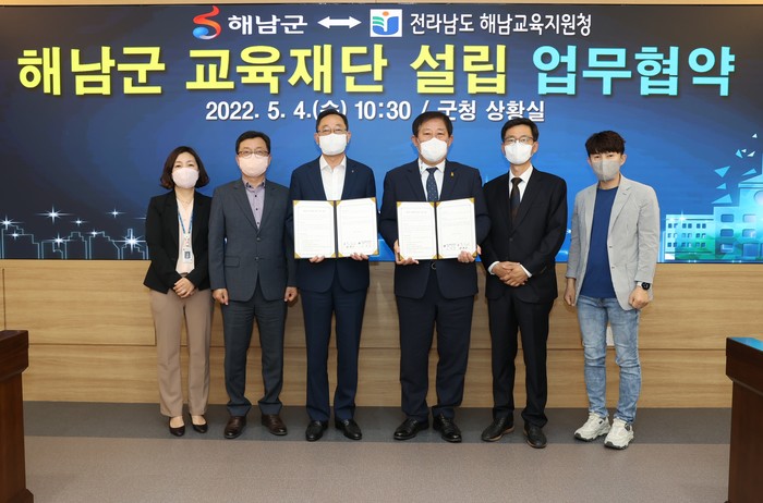 [해남=정찬남 기자] 전남 해남군과 해남교육지원청은 지난 4일 군청 상황실에서 해남군교육재단 설립에 따른 업무 협약을 체결했다.