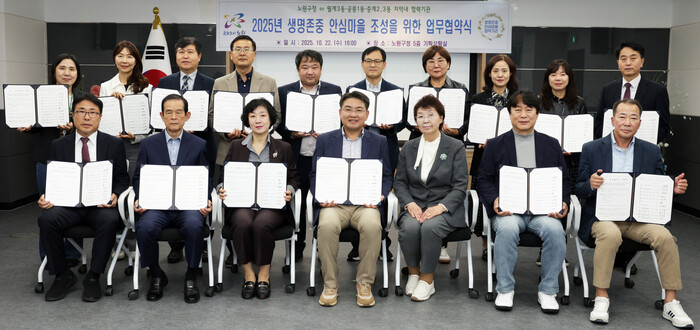 오승록 서울 노원구청장이 22일 구청 기획상황실에서 열린 ‘생명존중 안심마을 조성 협약식’에 참석해 관계 기관과 협약을 체결했다. 사진은 오 구청장(앞줄 가운데)이 협약을 체결한 뒤 관계자들과 기념 촬영을 하는 모습. (사진=노원구청 제공)