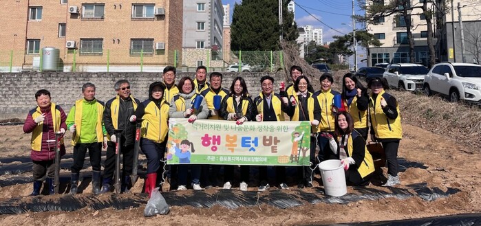 경기 이천시 증포동지역사회보장협의체는 20일 취약계층을 위한 ‘행복텃밭’에서 감자를 식재했다. 사진은 이날 참여한 협의체 위원들이 기념촬영을 하고 있는 모습. (사진=이천시청 제공)