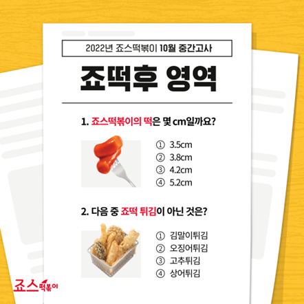‘죠떡후 영역’ 이벤트는 죠스떡볶이 덕후들을 위한 퀴즈 이벤트로 죠스떡볶이의 특징인 짧고 통통한 쌀떡의 길이와 떡 튀김 종류에 대한 문제의 정답을 댓글로 남겨 참여하는 방식이다. 이벤트 종료 후 추첨을 통해 10분께는 떡튀순 2인 세트 쿠폰을 증정한다.