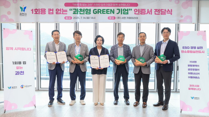 [과천=임종인 기자] 경기 과천시가 14일 (주)서현 사옥 10층에서 ‘과천형 GREEN 기업 인증서’ 전달식을 열고, 다회용 컵 사용 등 친환경 실천에 앞장선 5개 기업을 선정해 인증서를 수여했다.