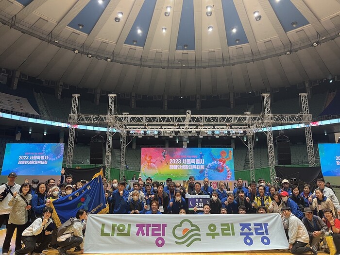 서울 중랑구가 최근 ‘2023 서울특별시 장애인생활체육대회’에서 종합 2위를 차지했다. 선수들은 동호인종목 5개(파크골프, 보치아, 조정, 축구, 농구)에서 열전을 펼쳤다. 사진은 중랑구 선수단이 기념촬영을 하고 있는 모습. (사진=중랑구청 제공)