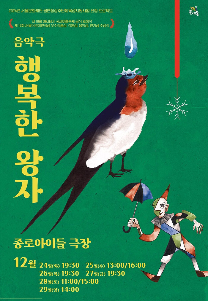 [시민일보 = 이대우 기자] 서울 종로구(구청장 정문헌)가 오는 24~29일 아이들극장(성균관로 91)에서 가족음악극 ‘행복한 왕자’를 선보인다.