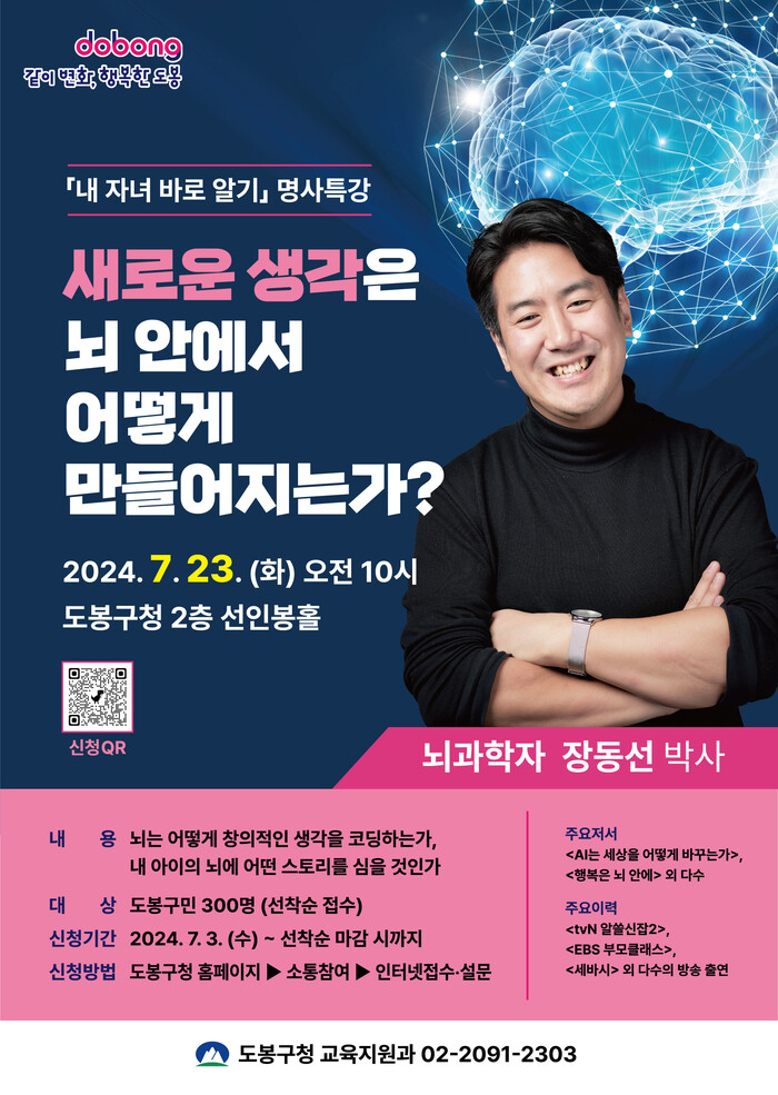 오언석 구청장은 “저명한 뇌과학자 장동선 박사의 강연을 통해 자녀를 뇌과학적 관점으로 이해하는 흥미로운 시간이 되길 바란다”며, “앞으로도 미래 교육을 준비하는 구민들에게 도움을 줄 수 있는 다양한 주제의 수준 높은 강연을 마련해 나가겠다”고 말했다.
