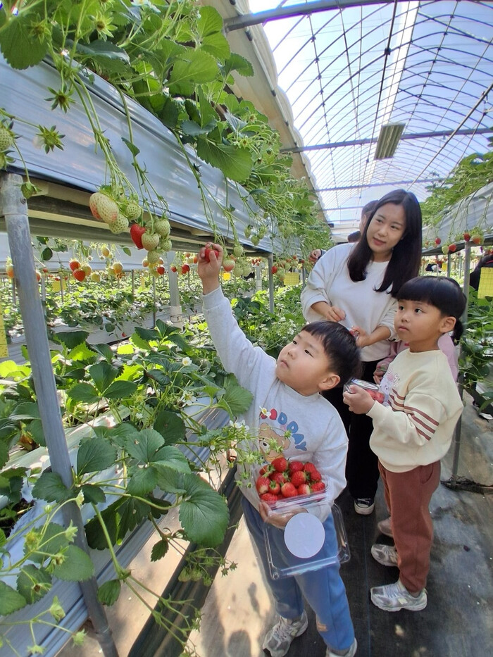 서울 구로구가 최근 드림스타트 가족 70명과 함께 경기도 화성에서 ‘2026년 상반기 우리 가족 나들이’ 프로그램을 운영했다. 사진은 드림스타트 프로그램 참여자들이 체험농장에서 딸기 따기 체험에 참여하는 모습. (사진=구로구청 제공)