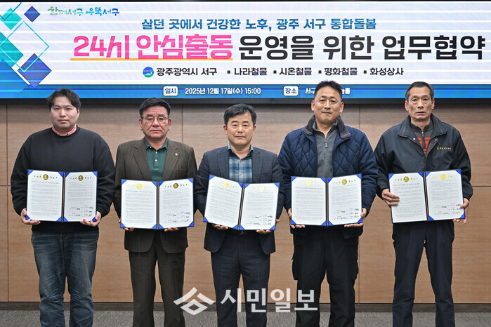 서구는 17일 서구청 나눔홀에서 관내 착한가게 4곳과 함께 ‘24시 안심출동’ 사업의 안정적 운영을 위한 업무협약을 맺고 빈틈없는 돌봄 서비스 제공에 협력하기로 했다.