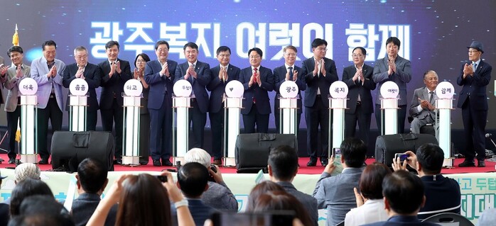 | ▲ 강기정 광주광역시장(오른 쪽부터 7번 째)이 27일 오후 시청 1층 시민홀에서 열린 ‘제25회 사회복지의 날 기념식 및 사회복지대회’에서 참석자들과 함께 퍼포먼스를 하고 있다. /광주광역시 제공 |