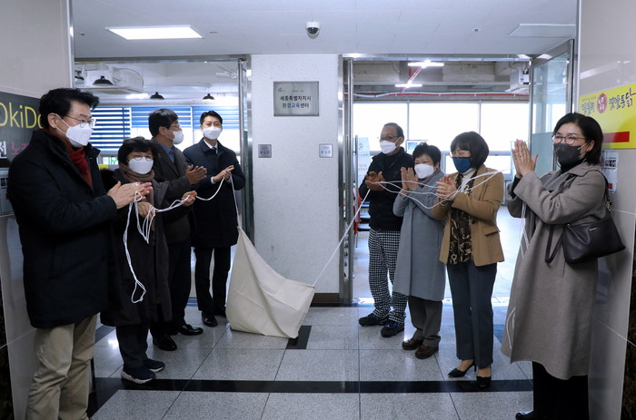 세종시는 23일 ‘세종시환경교육센터(고운서길19, 202호)’ 현판식을 진행했다. 환경교육센터는 시민·학교 대상 교육지원과 전문가 양성 등 역할을 담당하게 된다. 사진은 이날 관계자들이 현판식을 진행하고 있는 모습. (사진제공=세종특별자치시청)