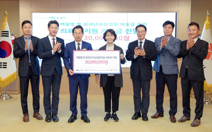 [광주=정찬남 기자] (재)한국의학연구소가 백혈병·희귀난치성질환 아동의 의료비 지원을 위해 후원금 3000만 원을 광주시에 전달했다.