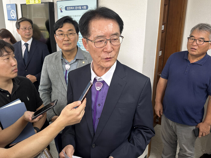 | ▲ 6일 오후 광주 동구 광주지법에서 박우량 신안군수가 직권남용 혐의 항소심 재판에서 당선무효형을 선고받고 입장을 밝히고 있다.(사진=연합뉴스 제공) |