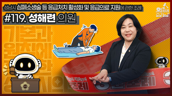이번에 소개된 조례는 성해련 의원 등 18명이 발의한 ‘성남시 심폐소생술 등 응급처치 활성화 및 응급의료 지원에 관한 조례’다. 이 조례는 「응급의료에 관한 법률」에 따라 심폐소생술 등 응급처치 교육·홍보 및 응급의료 지원 등에 관한 사항을 규정함으로써 성남시민의 건강과 생명을 보호하고 응급사항에서의 대응역량 향상에 기여함을 목적으로 한다. 이번 조례로 신속하고 적절한 응급처치가 생명을 구하는 데 결정적인 역할을 한다는 인식을 시민들에게 널리 알리고, 응급처치 교육의 참여를 독려함으로써 전 시민이 응급상황에 대비할 수 있는 안전한 도시 환경 조성에 이바지할 것이라 기대하고 있다. 이 조례는 2023년 12월 11일부터 시행 중이다.