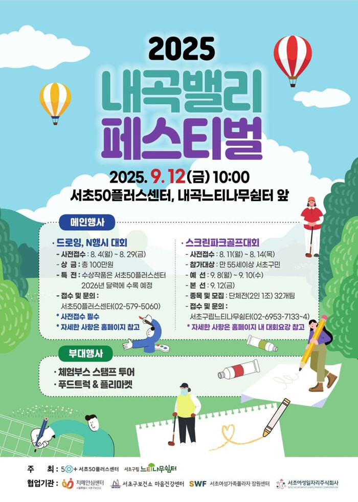 [시민일보 = 박소진 기자] 서초구(구청장 전성수)는 오는 12일, 서초50플러스센터와 내곡느티나무쉼터 앞에서 지역 주민과 함께하는 '2025년 내곡밸리 페스티벌'을 개최한다고 밝혔다.