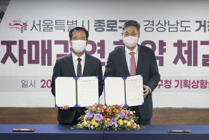 서울 종로구는 지난 22일 경남 거창군과 '자매도시 결연'을 맺었다. 사진은 이날 협약식에서 정문헌 구청장(오른쪽)과 구인모 거창군수가 협약서를 들고 기념촬영을 하는 모습. (사진제공=종로구청)