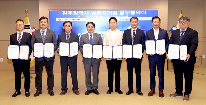 이날 협약식에는 강기정 시장을 비롯해 원포유 전동호 대표이사, 박격포 정창용 대표이사, 태영에스앤티 김기영 대표이사, 원퍼스트 하대수 대표이사, 랩팜 이용우 기술이사, 와이와이소프트 양홍현 대표이사, 시스포케어 공석만 대표이사 등이 참석했다.