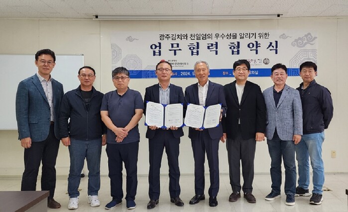 [광주=정찬남 기자] 광주광역시김치타운관리사무소(이하 광주김치타운)와 ㈜태평소금은 22일 김치타운 회의실에서 광주김치와 천일염의 우수성을 국내외 알리기 위한 업무협약을 체결했다.