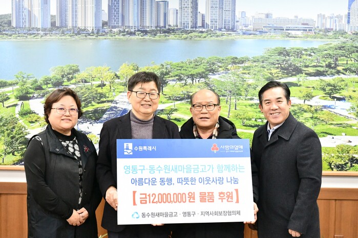 동수원새마을금고는 5일 설 명절을 맞이해 경기 수원시 영통구 지역내 취약계층을 위한 1200만원 상당의 맞춤형 후원물품을 기탁했다. 사진은 기탁식에서 김용덕 구청장(오른쪽 두 번째)과 관계자들이 기념촬영을 하고 있는 모습. (사진=영통구청 제공)