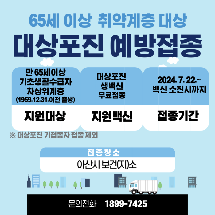 [아산=박명수 기자] 충남 아산시가 65세 이상 취약계층을 대상으로 대상포진 무료 예방접종을 실시한다고 밝혔다.