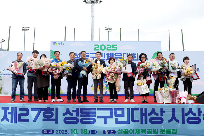 서울 성동구가 최근 성동을 빛낸 12명의 영광스러운 구민을 선정해 제27회 성동구민대상 시상식을 개최했다. 사진은 시상식에서 정원오 구청장(가운데)이 수상자들과 기념 촬영을 하는 모습. (사진=성동구청 제공)
