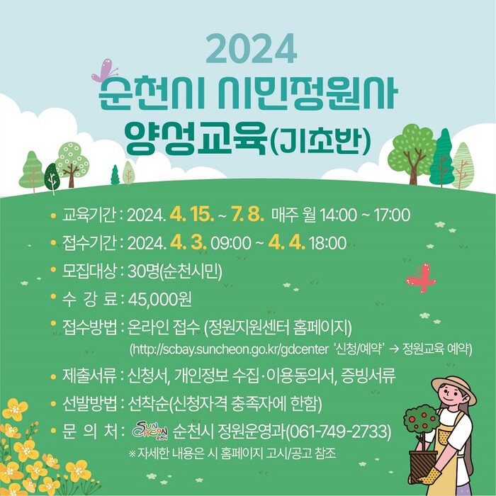 모집공고일 현재 순천에 주민등록을 둔 시민이라면 누구나 신청할 수 있으며, 4월3일부터 4월4일까지 시 정원지원센터 홈페이지 ‘정원교육 예약시스템’을 통해 접수할 수 있다.