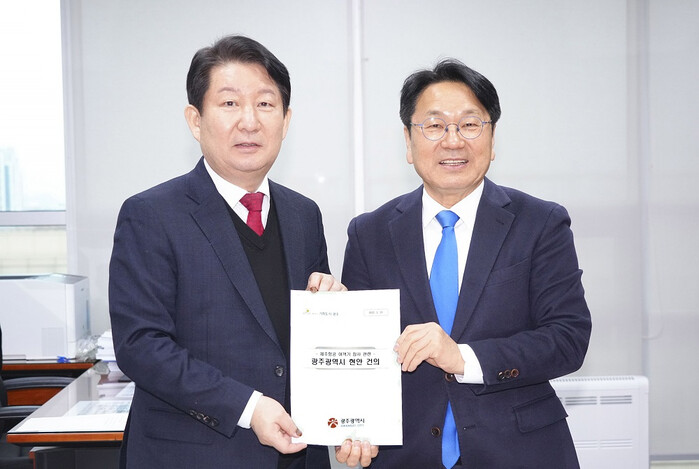 | ▲ 강기정 광주광역시장이 13일 오전 서울 국회에서 권영진 국회 제주항공여객기참사특위 위원장을 만나 제주항공 여객기참사 피해지원 특별법 제정 관련 건의서를 전달하고 있다./광주광역시 제공 |