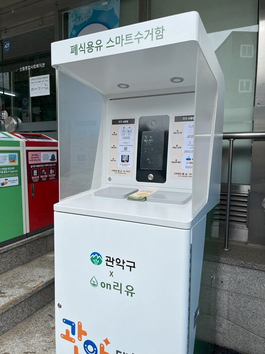 폐식용유 스마트수거함은 지역 주민과 소상공인들이 폐식용유를 쉽게 재활용할 수 있도록 제작된 무인회수기계이다. 폐식용유가 담긴 용기를 통째로 투입하면 되는 간편하고 위생적인 사용법이 특징이며, 투입량에 비례하는 재활용 보상까지 제공한다.