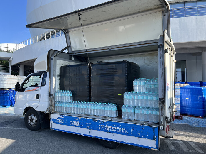 | ▲ 지난 5일 구가 강릉시에 1차로 긴급 지원한 생수 5000병(2리터)이 트럭에 실려 있는 모습. (사진=구로구청 제공) |