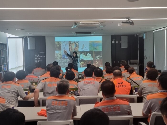 | ▲ 광주소방안전본부, 7일 비엔날레 사무동에서 관내 의용소방대 100명 대상 제14회 광주비엔날레 전문 안내원 시민 도슨트 프로젝트 기초과정 교육 / 광주광역시 제공 |