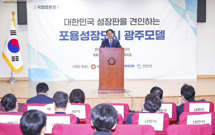 | ▲ 강기정 광주광역시장이 26일 오후 서울 국회의원회관에서 열린 '대한민국 성장판을 견인하는 포용성장도시 광주모델' 국회토론회에 참석해 축사를 하고 있다./광주광역시 제공 |