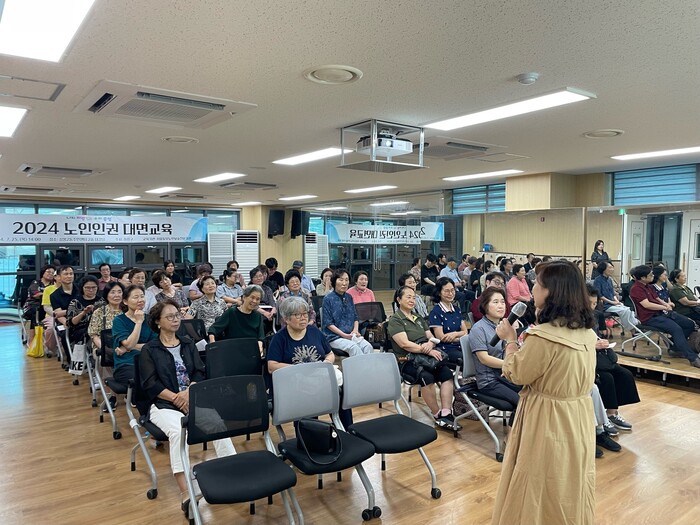 서울 중랑구가 최근 장기요양기관 종사자 38명을 대상으로 ‘2024 노인인권 대면 교육’을 실시해 서울동부노인보호전문기관 관계자들이 강사로 나서 노인인권의 기본 개념 등의 내용을 진행했다. 사진은 2024 노인인권 대면 교육이 진행되고 있는 모습. (사진=중랑구청 제공)