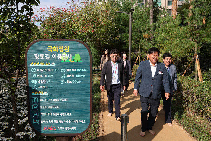 박강수 서울 마포구청장은 국화정원에서 열린 ‘국화정원 황톳길 개장식’에 참석해 황톳길을 걸으며 주민들과 함께 가을의 정취를 만끽했다. 사진은 박 구청장과 관계자들이 황톳길을 점검하고 있는 모습. (사진=마포구청 제공)