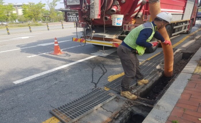 경기 수원시 영통구는 본격적인 장마철을 대비해 지난 15일부터 비상대책반을 운영한다. 사진은 최근 구 관계자가 주요 도로의 배수로를 점검하고 빗물받이 준설을 실시하고 있는 모습. (사진=영통구청 제공)