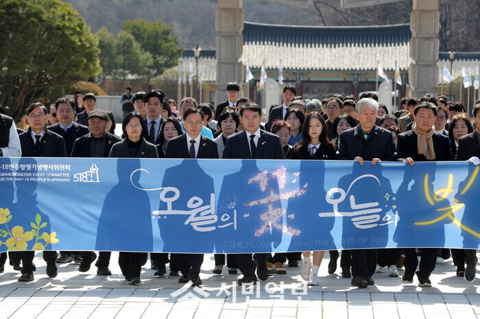 [광주=정찬남 기자] 고광완 행정부시장(앞줄 왼 쪽부터 네 번째)이 4일 국립5·18민주묘지에서 열린 제46주년 5·18기념행사위원회 출범식에 참석해 참배하기 위해 이동하고 있다. /광주광역시 제공