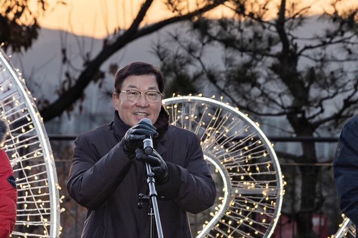 서울 광진구가 지난 1일 아차산 어울림광장에서 아차산 해맞이 축제를 열고 병오년의 시작을 구민과 함께했다. 서울에서 가장 먼저 해가 떠오르는 명소답게 이른 시간부터 시민들의 발걸음이 이어졌다. 사진은 김경호 구청장이 새해인사를 하고 있는 모습. (사진=광진구청 제공)