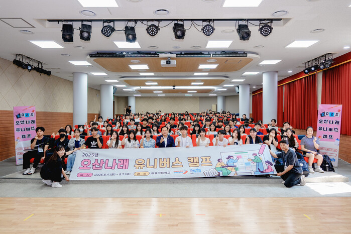 경기 오산시가 최근 5일간 매홀고등학교에서 지역내 고등학교 1학년 학생 100명이 참여한 가운데 ‘2025 오산나래 유니버스캠프 공유학교’를 성공적으로 개최했다. 사진은 이권재 시장이 학생들과 기념 촬영을 하는 모습. (사진=오산시청 제공)