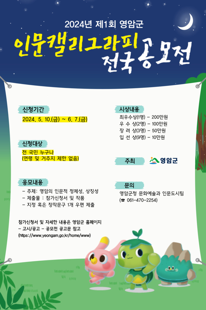 공모전에 대한 자세한 내용은 영암군홈페이지 고시ㆍ공고란을 이용하면 되고 안내는 영암군 인문도시 팀으로 문의하면 된다.